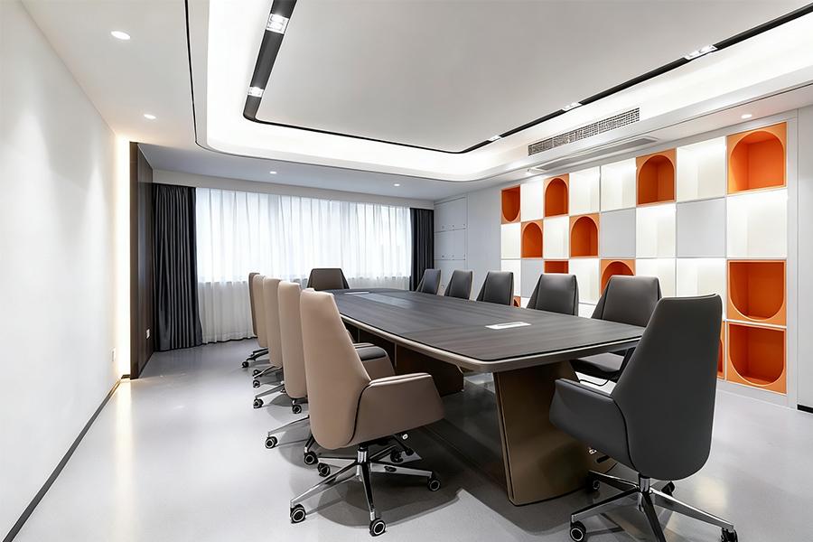 会议室作为企业沟通与决策的核心空间,在此次设计中也被赋予了别样的意义。四川壹西格玛建筑工程有限公司打造的会议室,以沉稳的色调为主,长形的会议桌大气稳重,周围环绕着舒适的座椅。墙面设计别具一格,橙白相间的方格造型,不仅增加了视觉上的层次感,更像是企业多元思维与创新精神的象征。充足的自然光线透过窗帘洒入,与室内灯光相互配合,为会议营造出明亮、专注的环境,助力每一次思想的碰撞与决策的诞生。