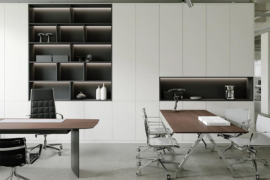沿着动线深入,独立办公室展现出截然不同的气质。深色木质办公桌沉稳大气,搭配黑色皮质办公椅,将专业与质感悄然融合。墙面的收纳系统设计精妙,内嵌灯带勾勒出层次,让陈列的书籍与摆件也成为空间装饰的一部分。在这里,无论是深度思考还是商务洽谈,都能感受到空间赋予的静谧与力量。四川壹西格玛建筑工程有限公司精准把握企业对于独立办公空间的需求,以细节处的打磨,彰显出对品质的极致追求。