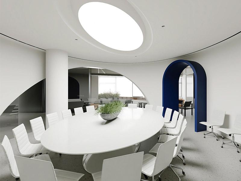 在会议室区域的打造上,壹西格玛装修设计巧妙运用流线型的弧形设计语言,将空间的柔和感与商务属性完美融合。设计团队精心搭配白色弧形天花板灯与弧形门洞,无论是沉稳的深蓝色弧形门洞,还是简洁的白色弧形结构,都与天花板灯形成巧妙呼应,瞬间弱化了传统办公空间的生硬棱角,让整个会议室更具亲和力。同时,以简洁的白色会议桌作为空间核心,桌面中央点缀鲜活绿植,既保障了商务洽谈所需的正式氛围,又借助自然元素打破了办公场景的沉闷,为每一次思维碰撞增添生机与活力,充分展现出壹西格玛对空间氛围营造的精准把控。