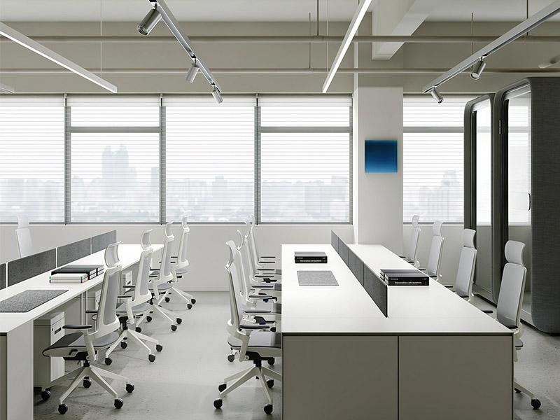 开放办公区作为员工日常工作的核心区域,壹西格玛装修设计以 “规整通透” 为原则,最大化释放空间价值。统一简洁的白色办公桌椅,搭配灰色隔断,在保障员工办公隐私的同时,避免了空间的压抑感,营造出开阔通透的视觉效果。照明系统采用轨道灯与线性灯组合设计,精准满足办公区域对明亮度的严苛要求;而裸露的天花板管线设计,则巧妙融入工业风元素,进一步强化了现代简约的设计风格,让开放办公区在高效实用的基础上,更具设计个性。