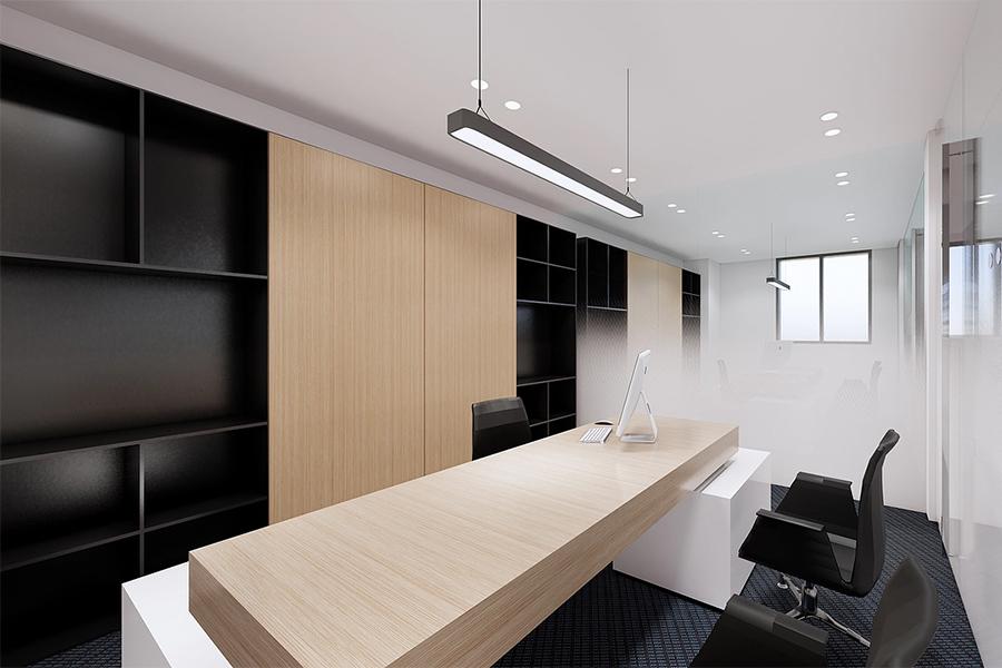 独立办公室的设计则体现了四川壹西格玛对细节的把控。木质的长桌搭配黑白相间的办公椅,既显稳重又不失现代感。一侧的黑木结合的收纳柜,提供了充足的储物空间,让办公环境保持整洁有序。另一侧的玻璃隔断,不仅保证了办公室的采光,还能让管理者随时了解外部的工作动态。悬挂的长条形灯具,为空间提供了充足的照明,营造出一种专注、高效的工作氛围。