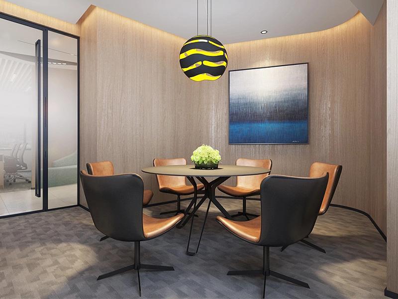 小型会议室则用温暖设计语言营造舒适沟通氛围。木质墙面传递温润质感,弧形空间弱化棱角生硬感;黄黑条纹球形吊灯如艺术装置点亮空间,抽象画作与桌面花艺点缀,让头脑风暴成为审美与创意的碰撞。