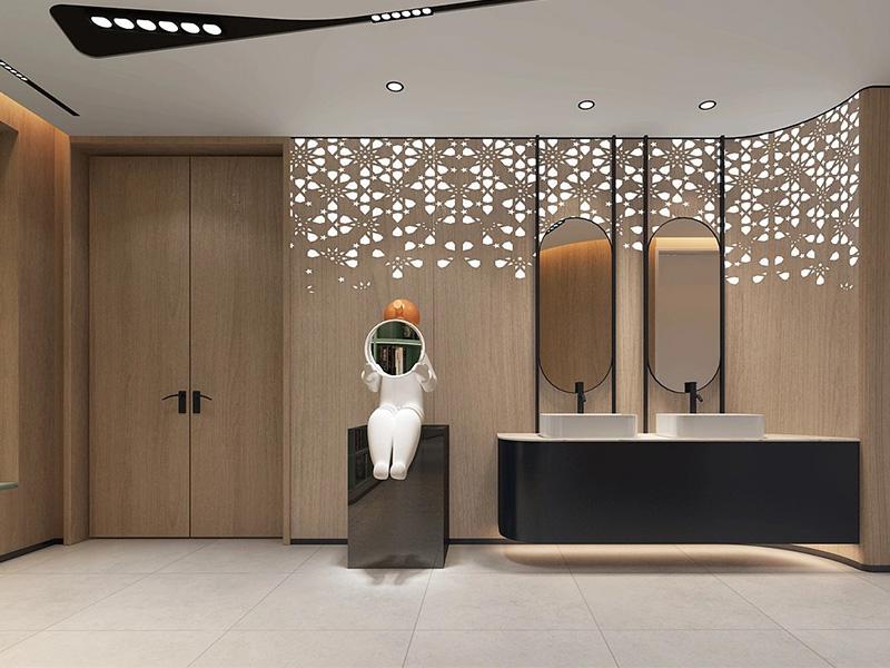 即便公共卫浴区,壹西格玛也倾注巧思。浅木色墙面搭配白色镂空雕花隔断,保障隐私的同时,借光影交错形成独特视觉效果;黑色悬浮式洗手台与椭圆形镜子简约大气,白色人形雕塑搭配橙色头部与圆形镜面的艺术装置充满趣味,让卫浴空间也成为艺术氛围的展示部分。