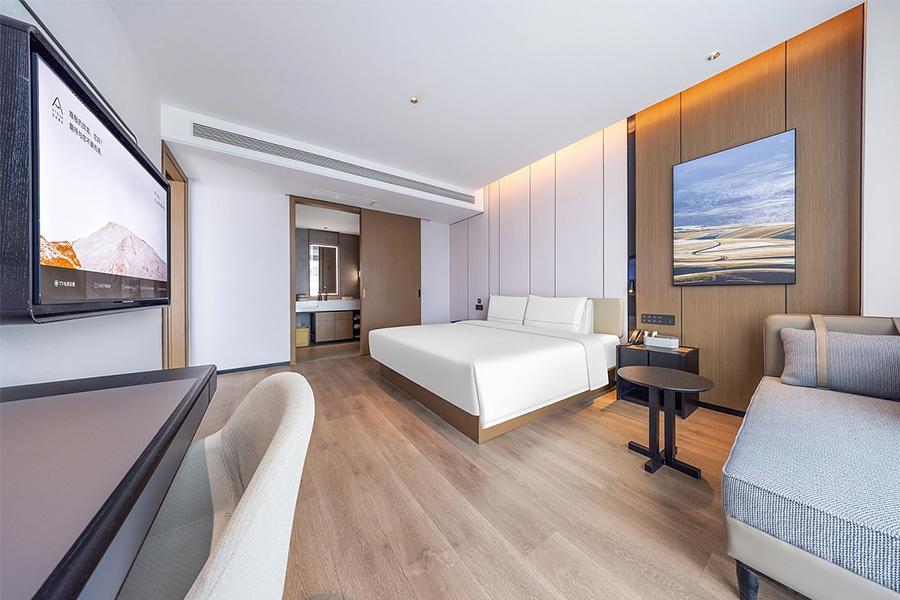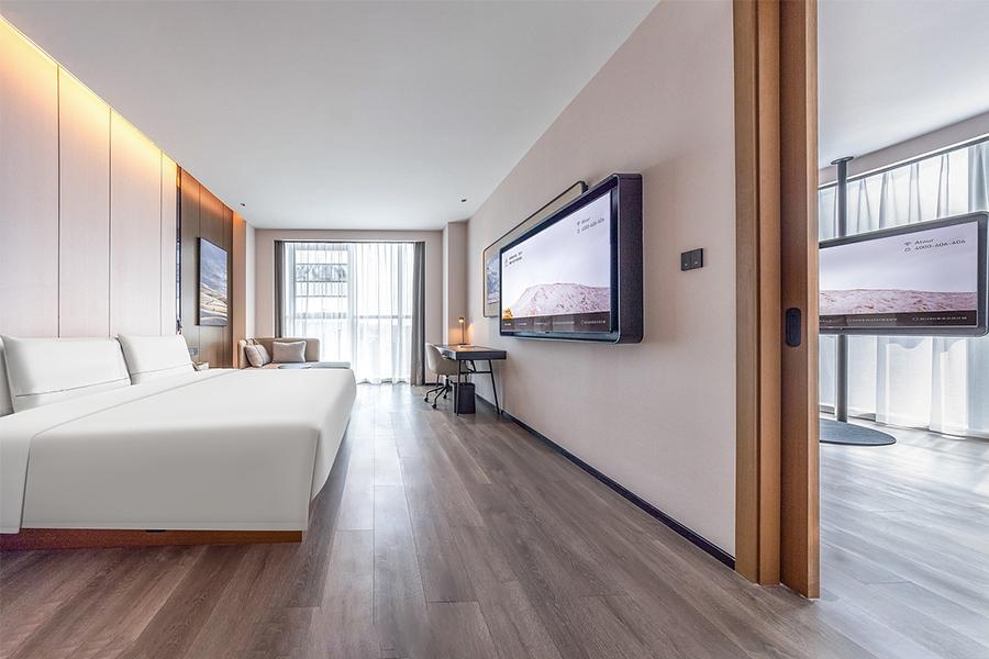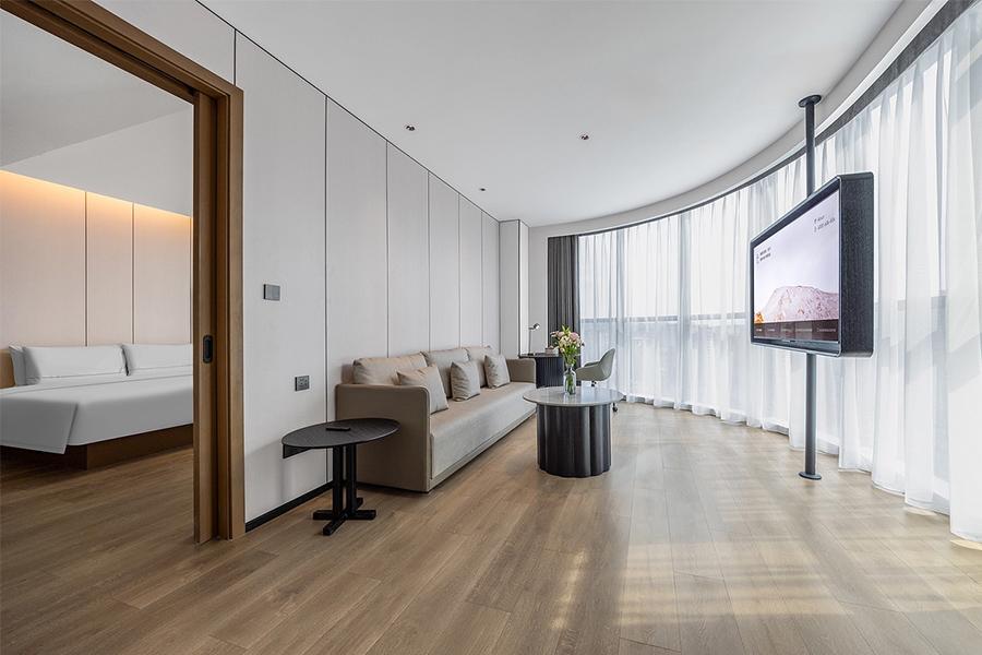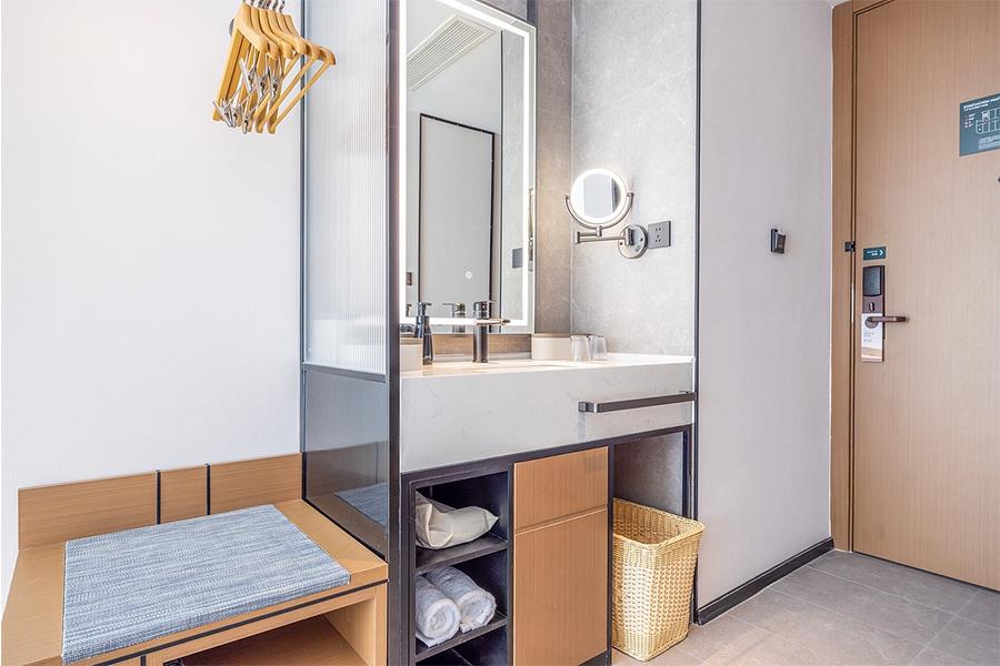 功能与美学的共生,是四川壹西格玛建筑工程有限公司设计哲学的核心。客房动线的规划处处体现着对人居体验的深度考量,睡眠区的大床、工作区的人体工学桌椅、休闲区的沙发小几,各自成区却又浑然一体,可旋转的电视装置更是巧妙地适配了不同场景的使用需求,无论是独处休憩还是亲友小聚,都能在空间里找到最舒适的姿态。卫浴间的灰色调美学同样令人称道,通体灰色瓷砖营造出冷静克制的氛围,智能马桶、精致的黑色五金件、原木搁板上的毛巾,每一处细节都彰显着四川壹西格玛建筑工程有限公司的精工品质,那些看不见的工艺,如瓷砖的平整度、五金的阻尼感、灯光的色温,都经过反复调试,只为给住客带来 “无需思考的舒适”。
