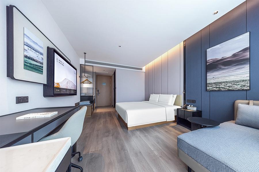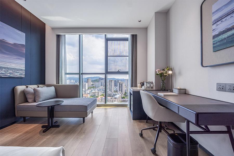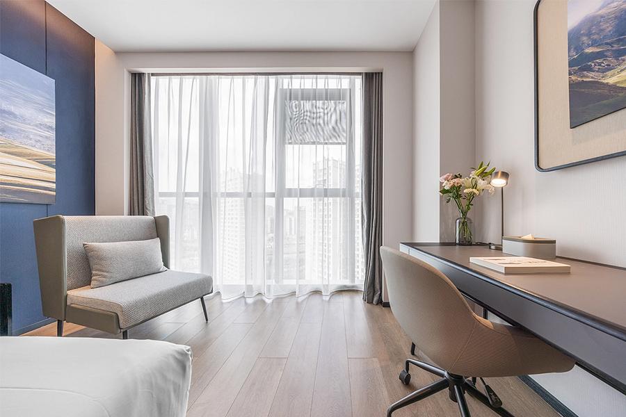 客房空间里,大幅落地窗如同一帧动态的城市切片,将成都的天际线、街巷绿意甚至远处的山影都框成了天然的艺术布景,晴时明朗,雨时朦胧,恰似老成都人泡茶馆时看天听风的悠然心境。而墙面那些以沙漠荒原为意象的艺术画作,又暗合了成都作为西南枢纽,兼容并蓄、连通四方的城市气质,在现代设计的语境下,完成了一次对在地文化的抽象转译。四川壹西格玛建筑工程有限公司从不追求符号的堆砌,而是将文化基因拆解为线条、色彩与质感,让它们在空间里自然生长,让住客于潜移默化中,便能触摸到成都的精神脉搏。