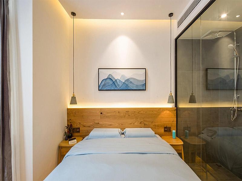 空间的功能划分从不是生硬的割裂,而是流动的有机整体。玻璃隔断将不同功能区巧妙区隔,既保证了空间的通透感,又实现了功能的独立;大窗户的设计让自然光线肆意流淌,窗边的休憩区或是一株绿植,或是一方小榻,让空间不再只是单一功能的场所,更成了与自然共呼吸的疗愈空间。保留木质结构原始质感的空间里,新旧材质的碰撞,让历史的厚重与现代的轻盈在此交融,梳妆台与休闲椅的搭配,更让空间兼具了实用性与美学性,每一处角落都透着设计师对生活细节的考量。