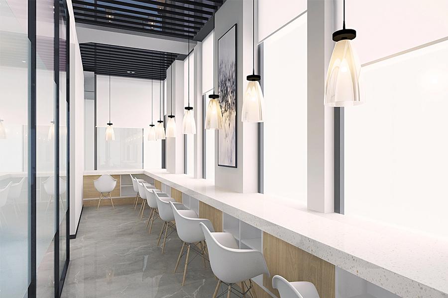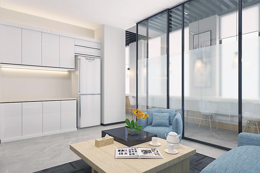 在高效办公之外,壹西格玛对 “人” 的体验关怀尽显于休闲区与茶水间的设计,这里是成都职场人的 “能量补给站”,长条吧台搭配简约白色餐椅,暖光吊灯营造出咖啡馆般的松弛感,茶水间白色橱柜与浅木色茶几的清新组合,蓝色沙发与黄色兰花的点缀,让员工在忙碌间能如在家中客厅般放松,这种 “家的延伸感”,是壹西格玛对成都 “烟火气” 的空间转译。总经理办公室则是领袖气场与人文温度的融合,壹西格玛以白色为主调塑造大气感,定制化白色办公桌线条利落,搭配高级灰与藏蓝色座椅彰显专业,内嵌发光展柜陈列艺术摆件与书籍,角落单人沙发区为商务洽谈预留舒适场景,在这里,壹西格玛用空间语言传递企业价值观:成都郫都区总部里,领导者的格局与温度皆可被空间看见。