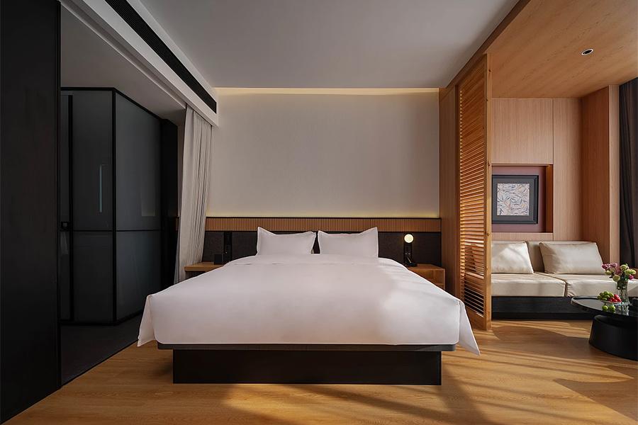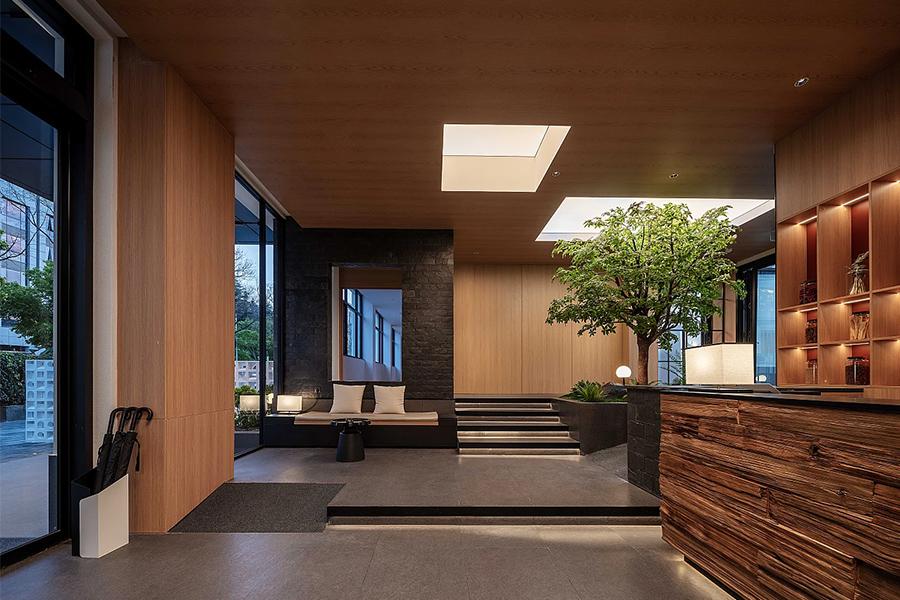 在公区大堂,粗犷的黑色石墙如川西峡谷的褶皱,与暖木色的天花形成强烈对比,天光从方形天窗倾泻而下,落在精心布置的绿植景观上 —— 这是对蜀地 “山、水、林” 自然格局的现代转译。接待台采用层叠的木质结构,仿佛从老成都的木构民居中提取的片段,每一道木纹都在诉说着时光的故事,让初入酒店的客人瞬间感受到在地文化的包裹感。