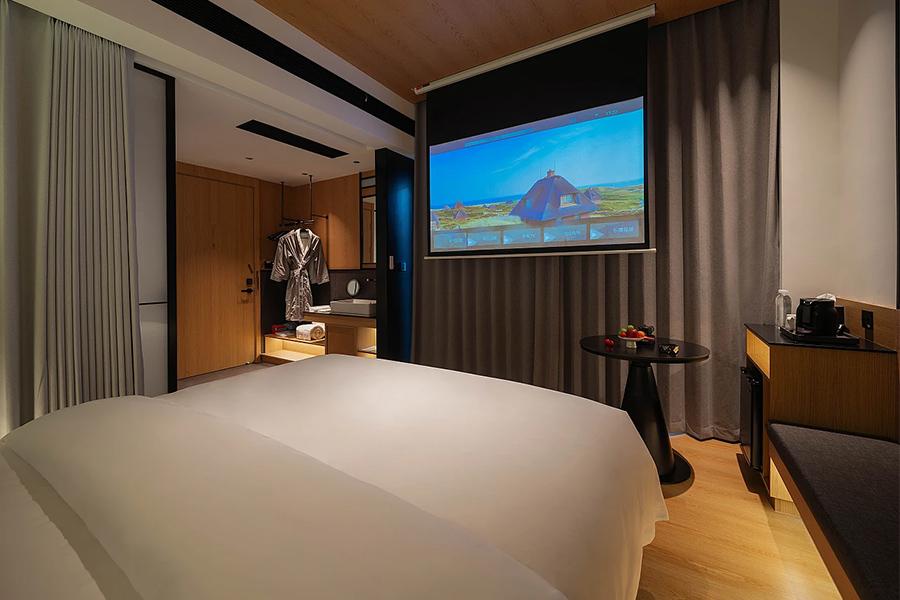 更令人称道的是 “场景化” 的设计巧思。有的客房配备了投影设备,幕布降下时,卧室瞬间变身为私人影院,满足年轻人对 “沉浸式体验” 的追求;有的客房辟出一方露台,木质格栅将光线切割成蜀地特有的慵懒模样,摆上一把藤椅,便能在此复刻 “成都式躺平” 的悠闲;还有的客房设置了雅致的茶歇区,黑陶茶具与鲜果绿植相映成趣,让住客在品茗间,读懂成都人 “把日子过成诗” 的生活哲学。
