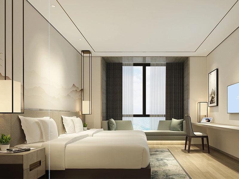 在材质的选择上,团队拒绝 “千篇一律”。客房的木地板采用了仿原木纹理的环保材料,脚感温润且防滑;墙面的艺术挂画,图案灵感来自蜀地的竹林与花卉,色彩雅致却不张扬;就连迷你吧的黑色柜体,都做了圆角处理,在功能性之外,多了一份人性化的温柔。