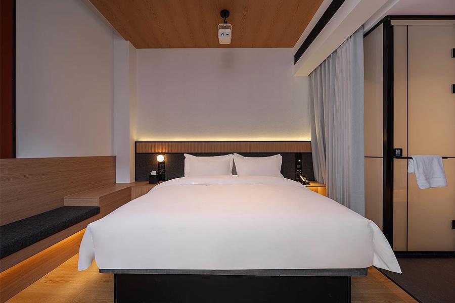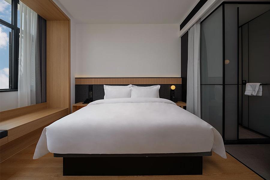 客房的布局堪称 “小而美” 的典范。开放式的卫浴空间以黑色玻璃隔断划分,既保证了通透感,又营造出私密边界;床头的线性灯带如夜空的星河,为休憩时光铺就温柔底色;那盏造型独特的床头灯,灵感或许源自成都茶馆里的竹编灯笼,在现代材质的演绎下,成为空间里的艺术点睛之笔。