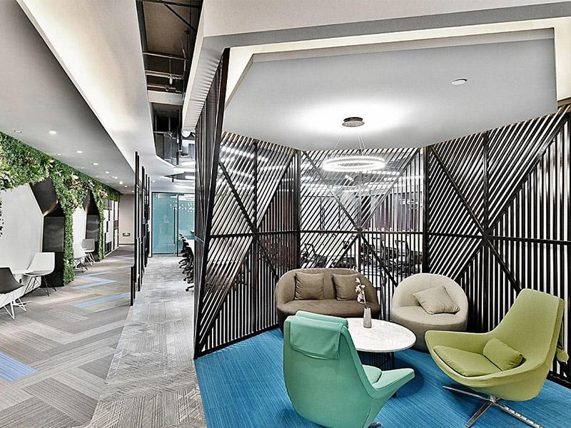 对于开放办公区,壹西格玛突破传统办公空间的刻板印象。通透玻璃隔断保障空间开放性,助力团队协作;活力撞色的工位屏风与工业风吊顶形成视觉对话,既保留办公区的利落感,又以色彩与线条注入创意活力。更妙的是,绿植元素与艺术玻璃的点缀,让冰冷的办公空间焕发生机,完美适配互联网、创意类企业对 “开放、创新、活力” 的场景诉求,真正做到 “让办公环境赋能工作效率”。