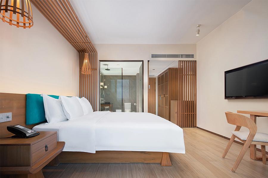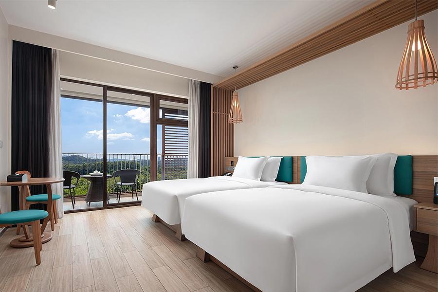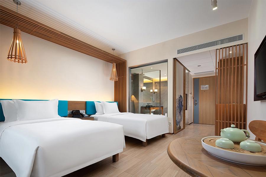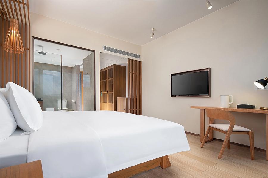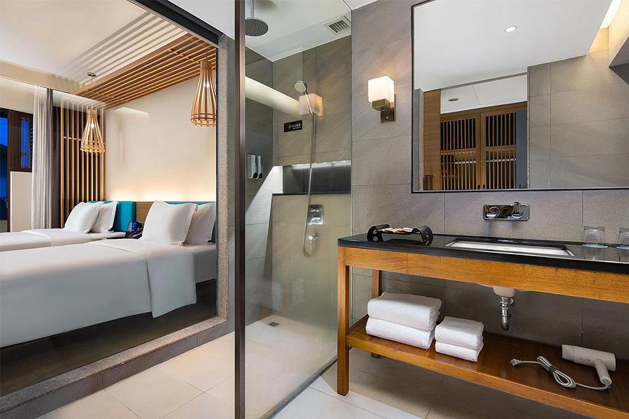 双床房的布局则兼顾了闺蜜出行与家庭旅居的需求,木质屏风巧妙划分空间,既保证了各自的私密性,又让整体氛围依旧通透。浴室的玻璃隔断设计更是点睛之笔,让光线得以自由穿梭,晨起时,阳光会先一步跳进房间,把人从梦中温柔唤醒。