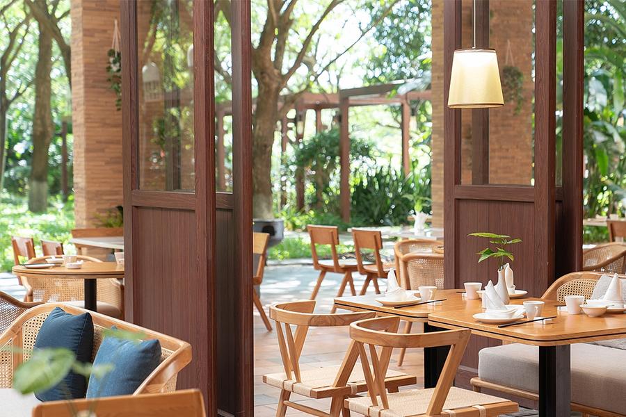 转至餐厅区域,“林中餐叙” 的浪漫被彻底拉满。木质隔断半掩着用餐区,既保留了空间的私密性,又让光影与绿意得以自由穿梭。藤编与实木结合的座椅,触感温润,一落座便让人卸下所有疲惫。最妙的是那片 “玻璃取景框”,推开门,参天乔木与婆娑竹影便扑面而来,阳光穿过叶隙洒在白瓷餐具上,像是大自然亲手布置的光斑装饰。