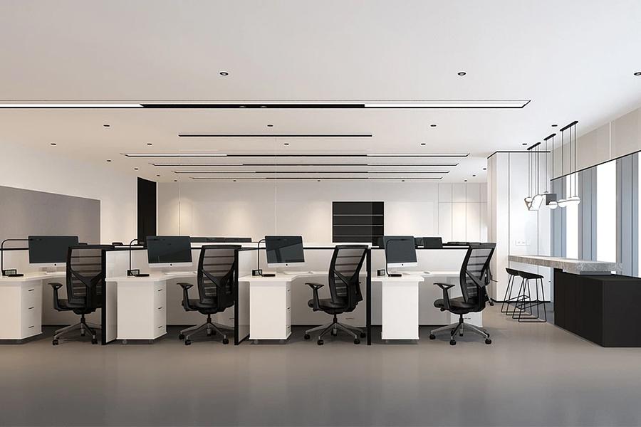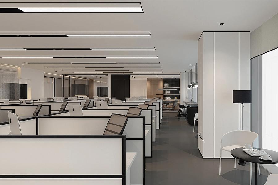 步入办公区,黑白灰的主色调构建起简洁大气的视觉基底,却又因原木元素的点缀、金属线条的勾勒而不显单调。开放办公区域内,壹西格玛定制的工位有序排布,白色柜体搭配黑色办公椅,形成利落的几何构图。线性灯带纵横交错,将光线均匀铺洒,既保障了办公区域的明亮通透,又为空间注入了现代科技感。员工在此可随时开展协作,亦能在专属工位上专注深耕,空间的弹性设计让创意与效率双向奔赴。