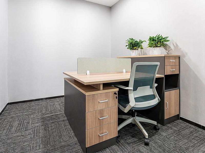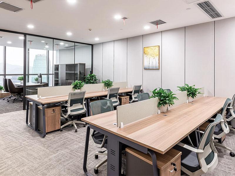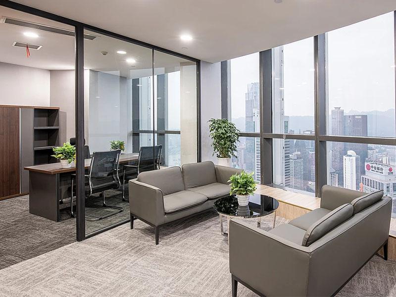 功能分区的巧思让空间价值最大化。接待洽谈区以灰色皮质沙发、玻璃茶几构建沉稳专业的交流场域,旁边的玻璃隔断办公间(如经理室)在 “开放” 与 “私密” 间找到精妙平衡;独立办公区的一体化桌椅与储物柜设计,精准适配个人办公的储物与专注需求;会议室里的长形会议桌、大白板与柔和灯光,为团队协作搭建起高效的思维碰撞平台。