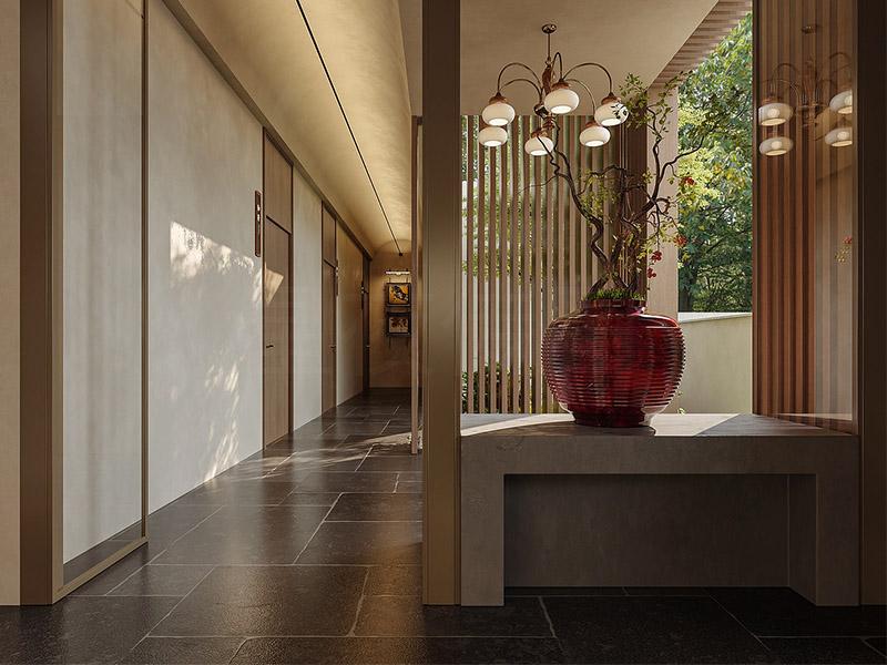 空间与自然的无界互动,是壹西格玛的设计灵魂。大面积落地窗与玻璃顶的运用,让客厅、阳光房彻底 “拥抱” 户外森林与天光。弧形木质书架上的书籍与摆件,棉麻沙发的松弛形态,让居住者在阅读、对弈时,随时能与自然光影共舞。这种 “把自然搬进家” 的巧思,在走廊区域也有体现 —— 深色石材地面延伸至木质格栅处,红色陶罐花艺成为视觉锚点,虚实之间,禅意层次悄然递进。