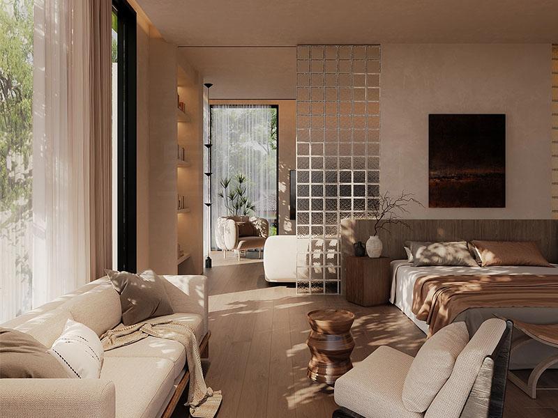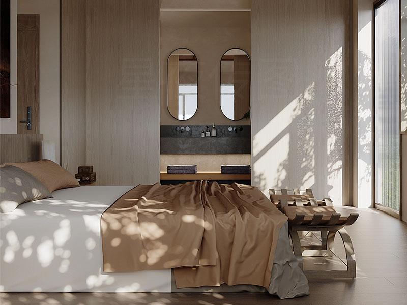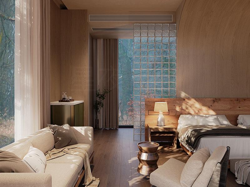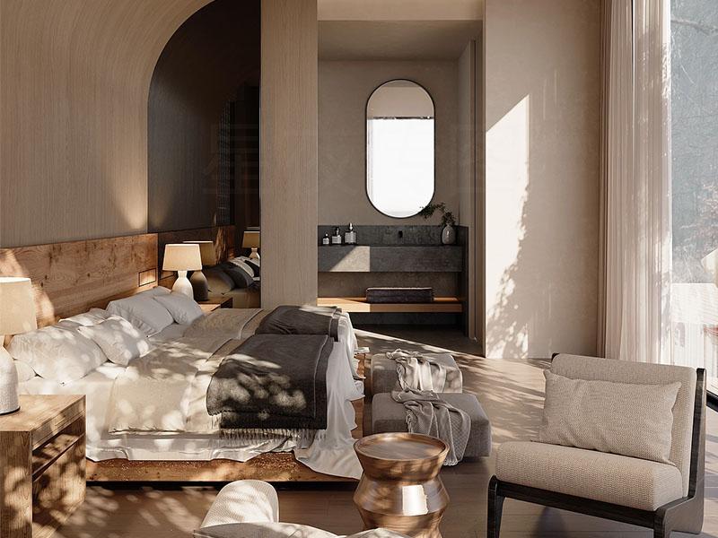 空间布局上,壹西格玛擅长在开放与私密间寻得精妙平衡。卧室与休闲区、卫浴区以玻璃砖隔断、弧形墙体等元素 “半开放” 分隔,既保留了空间的通透感,又悄然划分出功能边界。自然光可自由穿梭于各个区域,树叶的光影在墙面与家具上跳跃,让静态的空间有了动态的自然意趣。动线设计流畅自然,从起居到休憩再到卫浴,每一次移步都似在自然中漫游,消解了都市生活的局促感。