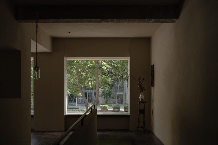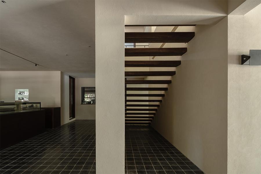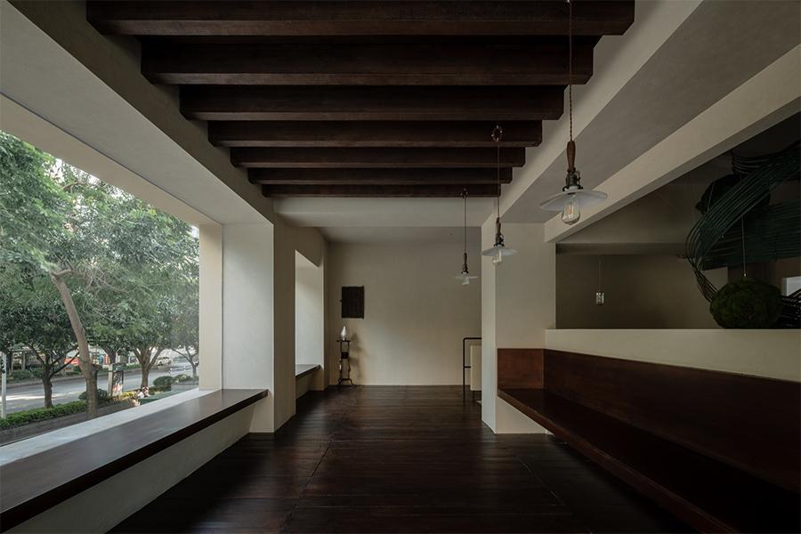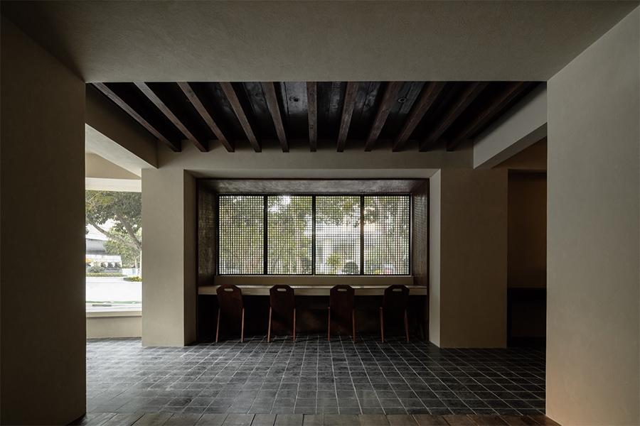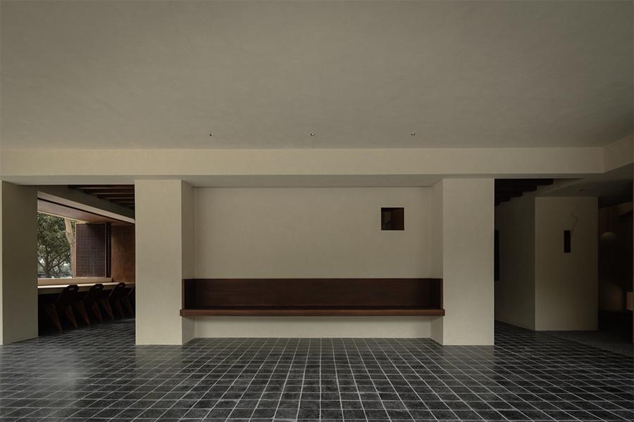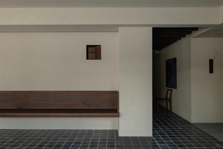 奶杏色的微水泥墙面带着细腻的肌理,像被春日阳光晒软的棉花,顺着空间的走势铺展成温柔的底色;脚下的哑光黑砖沉静得像深夜的巷弄,与墙面的柔糯感轻轻碰撞,又衬得一旁深胡桃木楼梯愈发温吞 —— 每一级台阶都浸着岁月打磨后的质感,踩上去的声响轻得像一声叹息。抬头看,裸露的深色木梁顶未做任何修饰,粗粝的纹理里藏着老成都巷弄的烟火气,却与墙面的软意拧出奇妙的平衡,像是四川壹西格玛特意保留的生活褶皱,让空间少了冷硬的距离感。