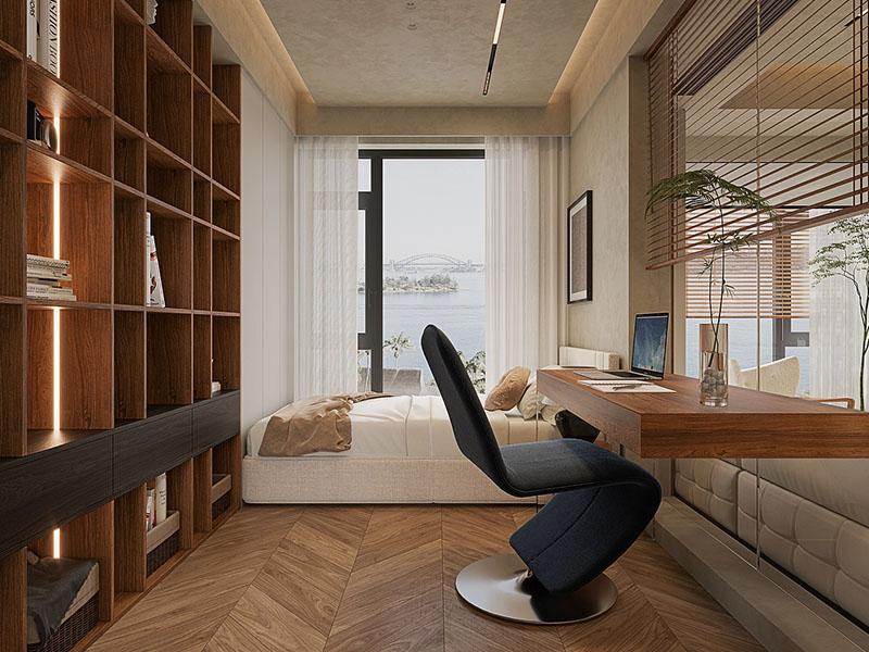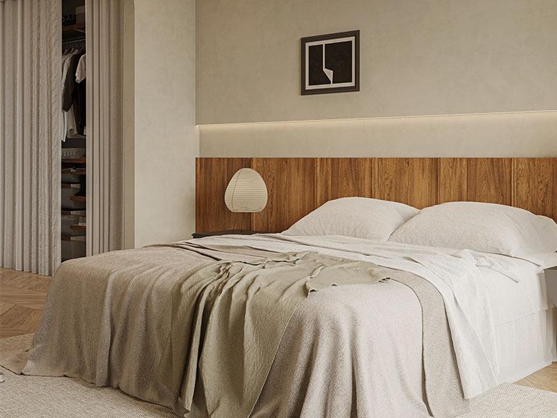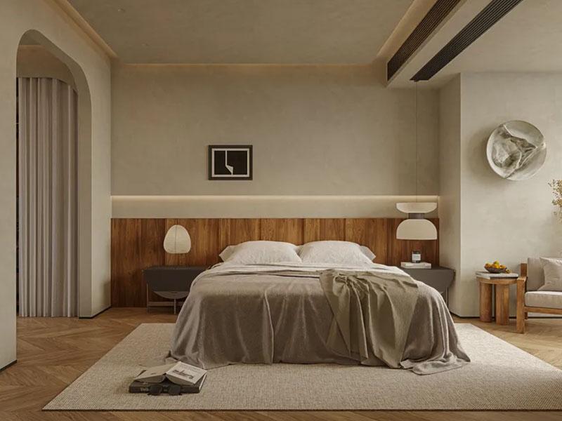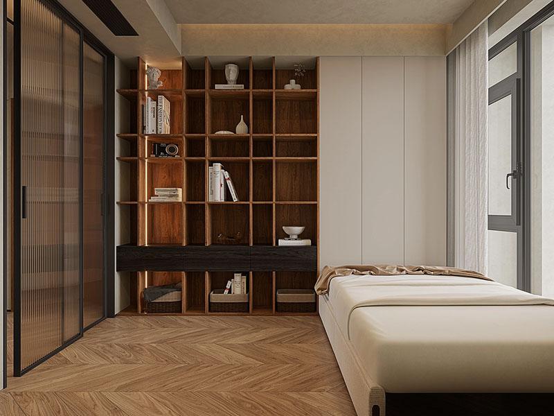 卧室区域是壹西格玛营造温馨感的核心阵地,大量胡桃木材质的运用成为点睛之笔 —— 床头板、定制书柜与地板形成统一的木色体系,自然纹理传递出质朴温润的气息,与米白、浅灰的墙面、软装形成柔和对比。细节处更见匠心:床头背景墙暗藏灯带,在夜间散发柔和光线,既避免了强光刺眼,又为空间增添了层次感;格子书柜兼具收纳与展示功能,内嵌灯带让陈列的书籍、摆件更具氛围感;地板采用人字拼铺法,在简约空间中注入精致细节,让平凡的地面成为空间的隐性装饰。