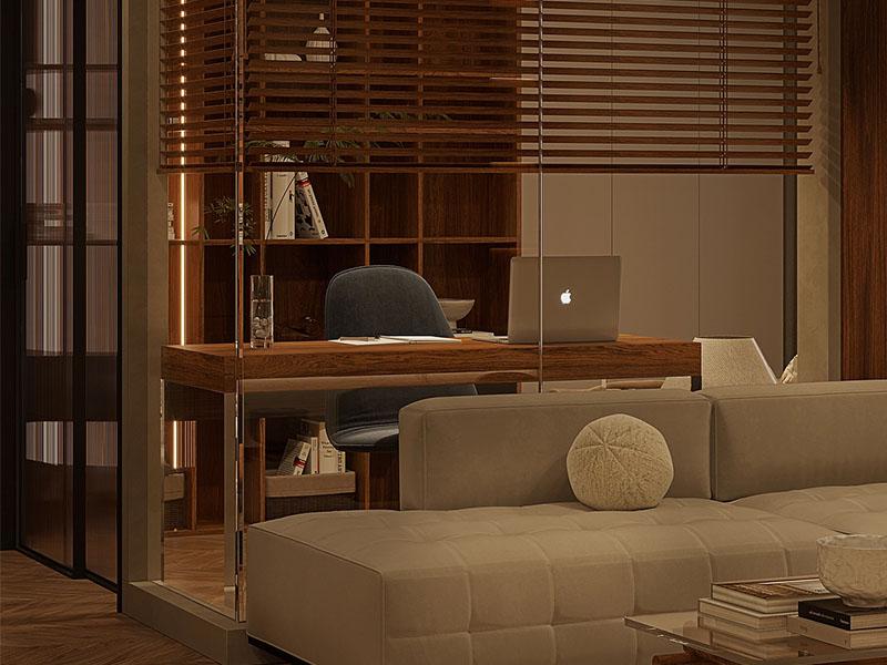 空间设计上,壹西格玛打破功能分区的刻板界限,采用半开放布局实现空间的通透与互动。客厅与书房以玻璃隔断、木质百叶衔接,既保证了各自的功能独立性,又让光线自由穿梭,让两个空间形成视觉上的呼应与延伸。客厅的模块化沙发线条简约却不失设计感,搭配柔软的针织抱枕,为日常休憩提供舒适载体;书房的实木书桌纹理自然,搭配人体工学椅,在满足办公学习需求的同时,融入整体美学氛围,让实用与雅致完美平衡。