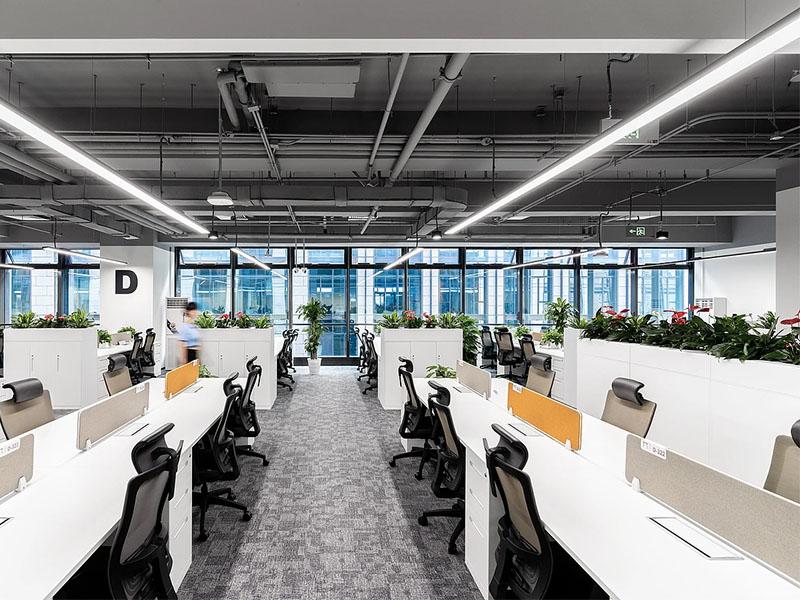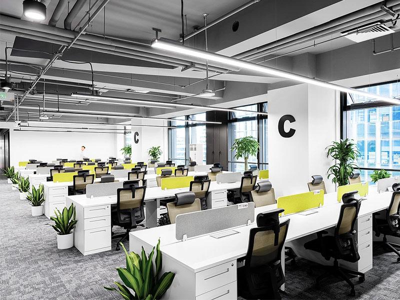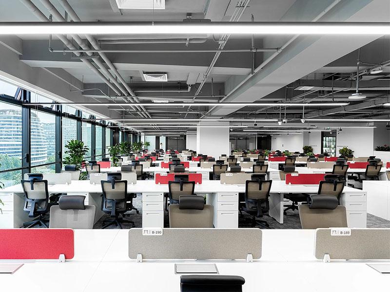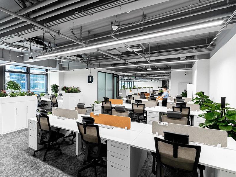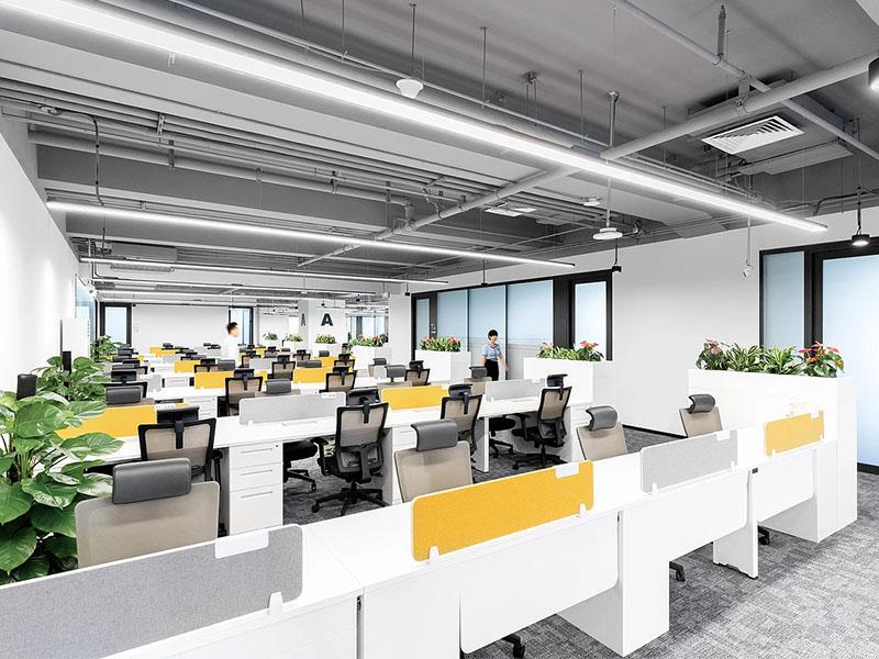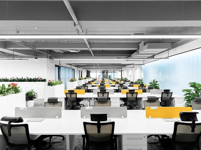 开放办公区采用模块化工位与半高隔断相结合的布局,既保障了团队协作的开放性,又通过黄色、红色、橙色等亮色隔断为空间注入活力,同时为每位使用者保留了适度的私密感。裸露的天花板管线融入工业风元素,搭配线性灯带,不仅简化了视觉层次,更增强了空间的现代感;大面积落地窗引入充足自然光,让整个办公区显得明亮通透,而散尾葵等绿植的点缀,既缓解了视觉疲劳,又为钢筋水泥的空间增添了自然生机。工位旁的独立储物柜与清晰的桌面标识,让整洁有序成为空间的常态,充分兼顾了实用性与美观度。