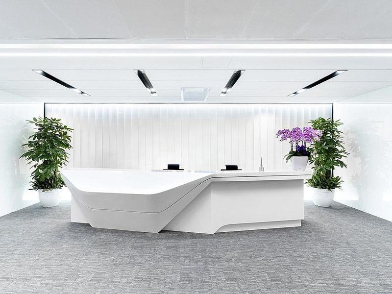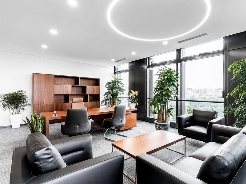 管理层办公室与接待区更显高端质感,总裁办公室以黑棕与灰白为主色调,木质书柜、皮质沙发与大尺寸落地窗相得益彰,既满足办公需求,又能从容承接接待场景,彰显沉稳大气的商务气质。前台区域则以流线型白色接待台为核心,搭配蝴蝶兰等简约装饰,用极简设计传递出企业的专业形象,成为空间的点睛之笔。