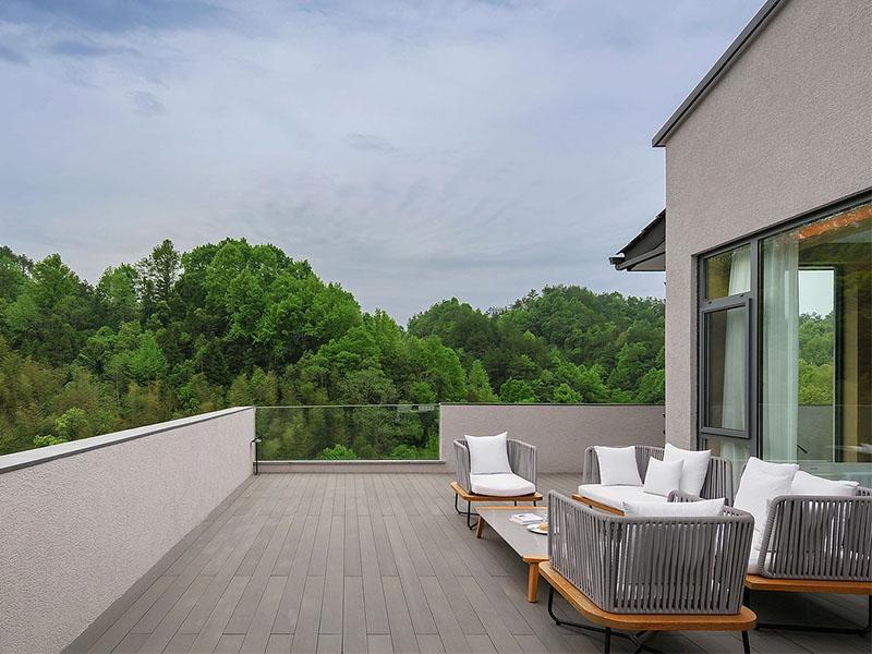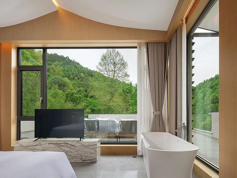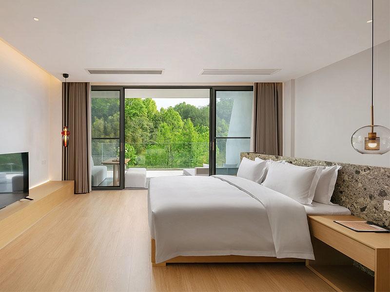 空间布局上,壹西格玛深谙 “框景” 之道。大面积落地窗与玻璃门将户外山林、沙漠等景观 “拉” 入室内,使自然成为动态壁画。客房内家具疏朗通透,休息区、办公区划分清晰却不割裂,既满足实用需求,又不遮挡观景视线;公共区域如茶室,以古朴木质桌椅搭配简约线条,在光影流转中营造出远离喧嚣的静谧感。这种设计让居住者视线自由穿梭于室内肌理与室外野景,实现建筑与自然的双向奔赴。