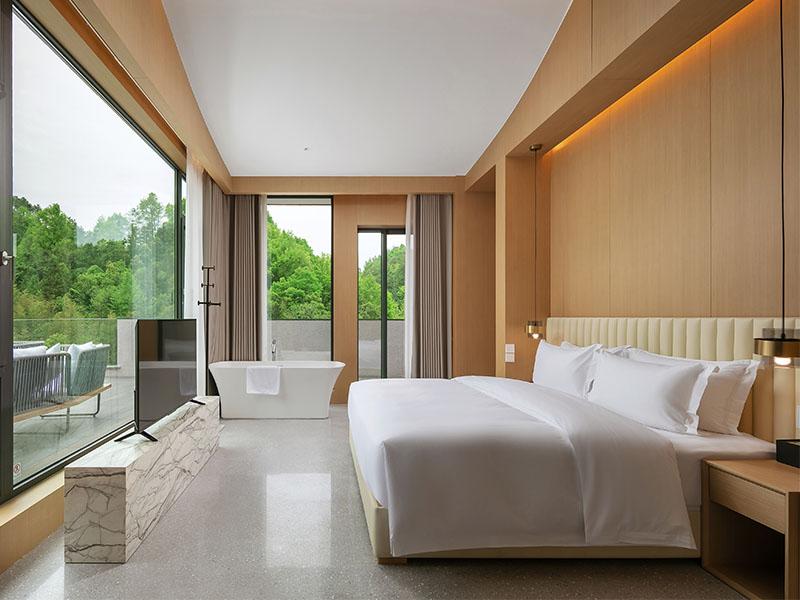 色彩体系取自在地景观,宛如大地的调色盘。米色、驼色、深棕与原木色交织,恰似沙漠日出的渐变层次,温暖而沉静。在客房设计中,浅木色为主调搭配白色床品,辅以低饱和亮色点缀,既保持空间通透,又传递温馨氛围;新中式风格项目则以淡雅米色、灰色融合深木色,兼具古朴韵味与现代简洁。这种色彩语言让室内外边界悄然消融,阳光洒落时,空间便被大地色调温柔包裹。
