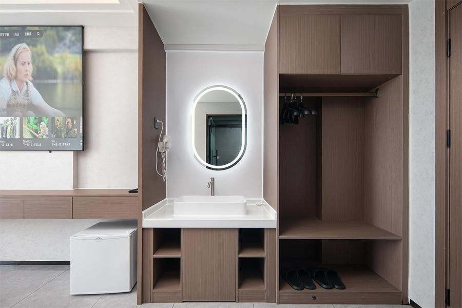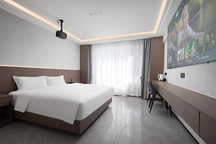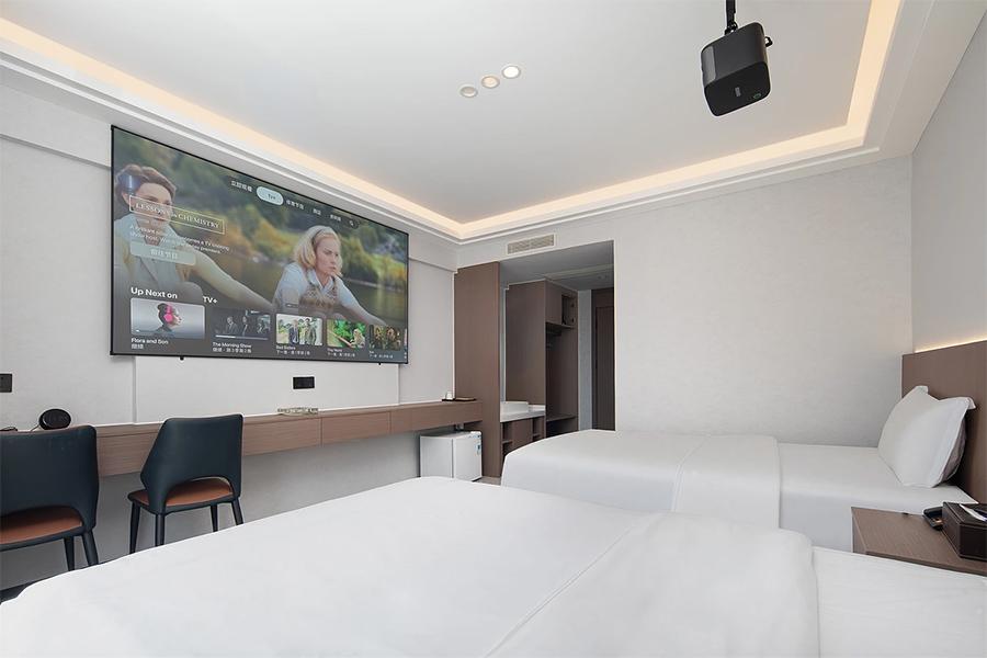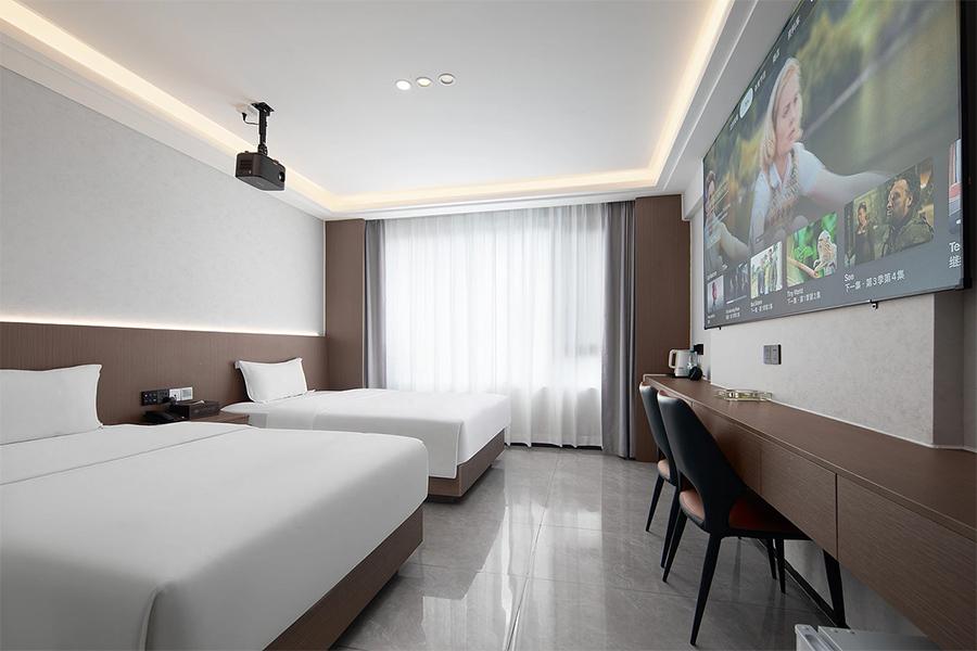 美学之下,是对功能场景的深度重构。客房“影音沉浸区”堪称点睛之笔,吊顶投影与超大幕布构建私人影院,团队反复调试安装角度与墙面反光率,确保白天观影清晰,线路则全隐藏处理;书桌区采用一体化长桌搭配人体工学椅,嵌入式抽屉与侧边柜体收纳随身物品及迷你电器,兼顾办公与休闲;睡眠区床间距超1.2米保障隐私,床头带USB插座与可调节开关,高弹性床垫搭配高支棉床品,隔绝喧嚣的遮光窗帘,全方位营造深度睡眠环境。公共区域同样用心,挑高大堂配简约艺术装置,模块化休息沙发灵活适配人流,走廊嵌入式壁灯与导视灯带营造静谧氛围。