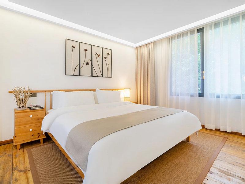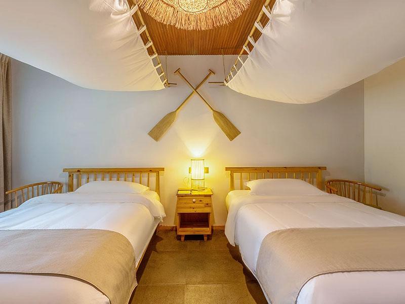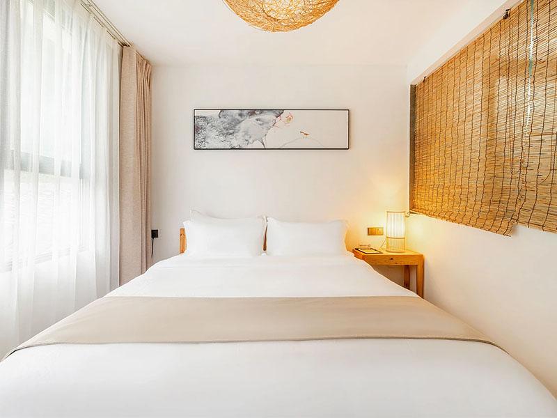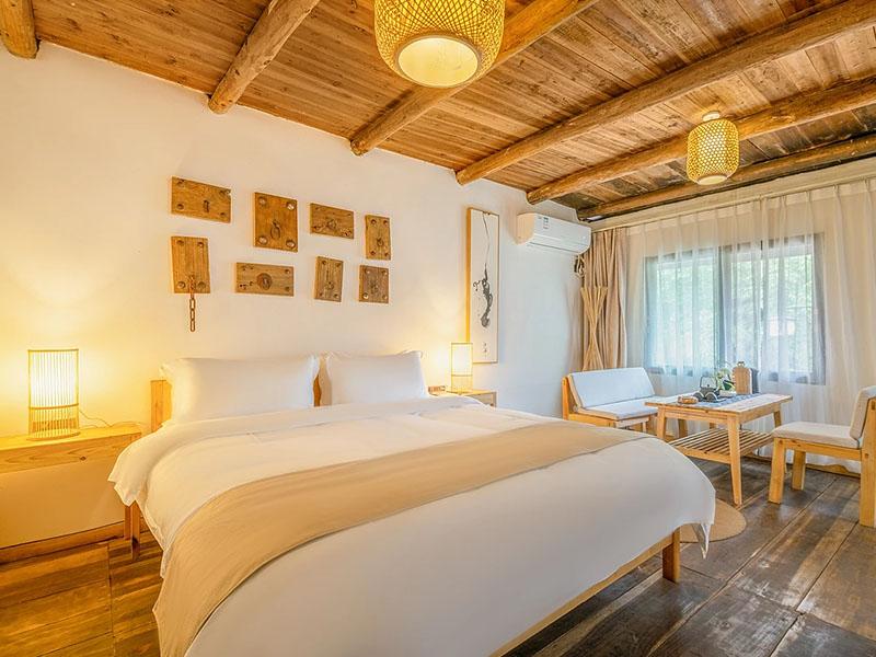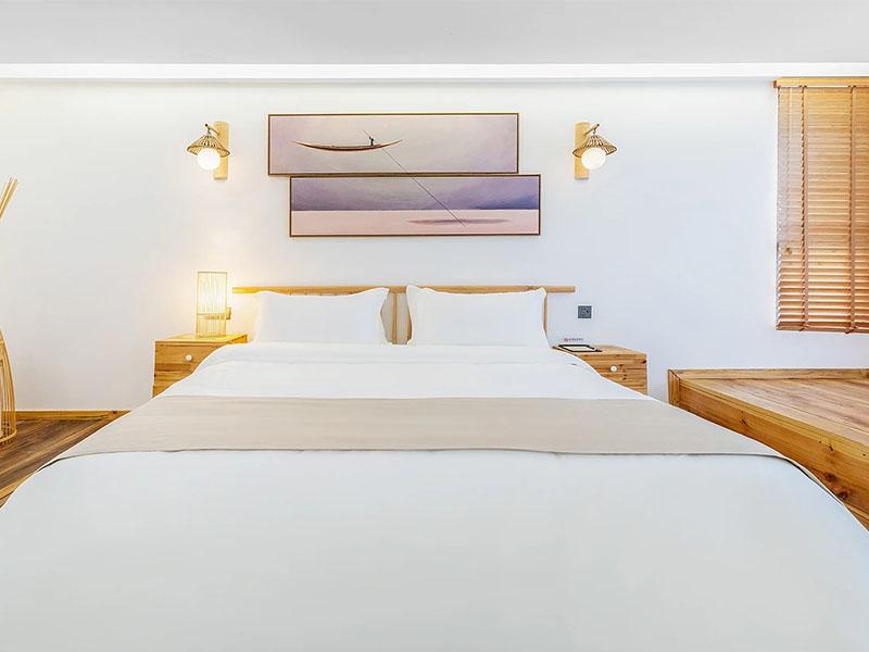 设计中的细节巧思更让空间焕发生机与叙事感:部分房间保留了原木屋顶的自然弧度与原生纹理,裸露的木梁勾勒出质朴随性的轮廓;墙面点缀的水墨装饰画、悬挂的复古船桨,或是角落摆放的绿植盆栽,既不破坏整体的简约基调,又为空间增添了独特的艺术气息与故事感,避免了素色设计可能带来的单调感。