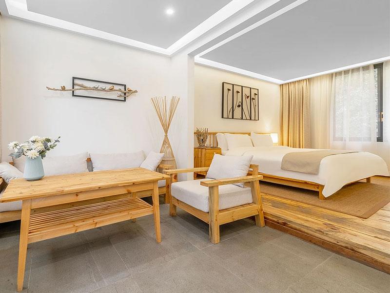 考虑到现代人对慢生活的向往,部分空间特意设置了休闲茶区,原木茶桌搭配简约茶具,周围环绕着舒适的休闲座椅,与整体风格一脉相承,为居住者开辟出可以静下心来品茶、阅读、冥想的专属角落,完美契合了人们逃离城市喧嚣、寻求内心平静的核心需求。壹西格玛的设计从不追求刻意的精致,而是通过材质的自然碰撞、色彩的和谐调和、空间的合理留白,营造出 “不费力的舒适”,让每一间客房都成为治愈身心的温暖港湾。这种将自然融入生活、以简约对抗浮躁的设计哲学,正是壹西格玛最动人的特质,也使其成为追求质感与松弛感居住体验者的理想之选。