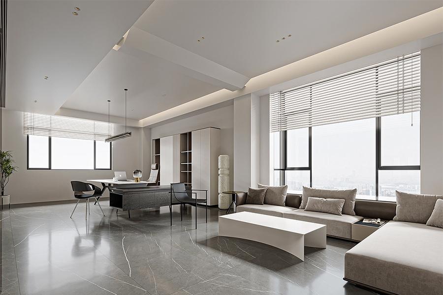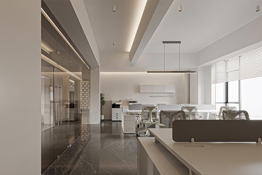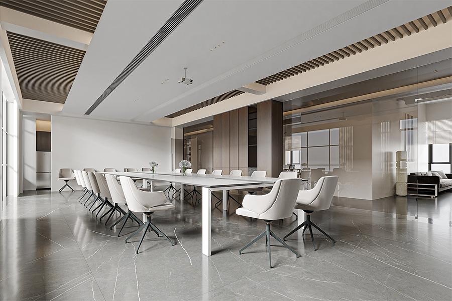 空间以哑光白与浅灰色为基底,搭配深色大理石地面,形成层次分明的极简视觉体验,既契合商务调性又缓解视觉疲劳。材质选择兼顾实用与环保,结合成都潮湿气候选用防潮耐造材料与环保板材,地面防滑、墙面耐擦洗的特性实现了美学与实用的无缝衔接。