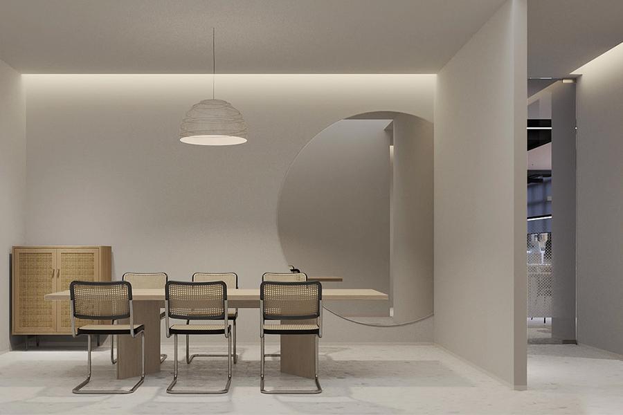 踏入空间的第一步,极简主义的前台便铺展开高级质感 —— 竖向纹理的墙面在嵌入式灯光的晕染下,勾勒出柔和却不失力量的轮廓,浅米色的一体成型接待台消解了传统办公空间的刻板,让访客的第一印象便落足于 “松弛的精致”。沿动线深入,走廊以利落的线条与柔和的弧形元素形成对话,浅色调的墙面衬着艺术画作与通透的门洞,让原本狭长的过渡空间成为了艺术与功能的衔接带,每一步行进都伴随着视觉层次的舒展,即便在商务节奏里,也能感知到空间的呼吸感。