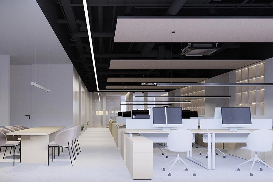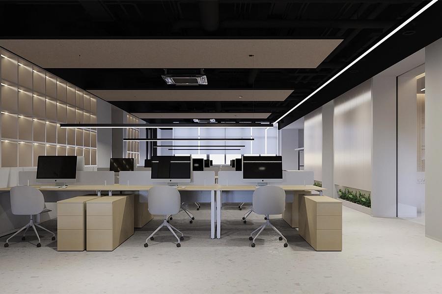 开放办公区是协作与舒适的主场:浅色系的办公家具以轻盈的姿态铺陈,简洁的线条与人体工学座椅兼顾了效率与体感,顶部的线性灯光与局部的嵌入式照明交织,既保障了工作所需的明亮,又避免了强光的生硬;墙面的格栅与暗藏的绿植点缀,让理性的办公场域多了几分自然的松弛,即便是密集的协作时刻,也能让思绪在舒适的氛围里流转。