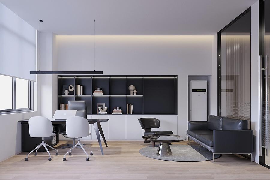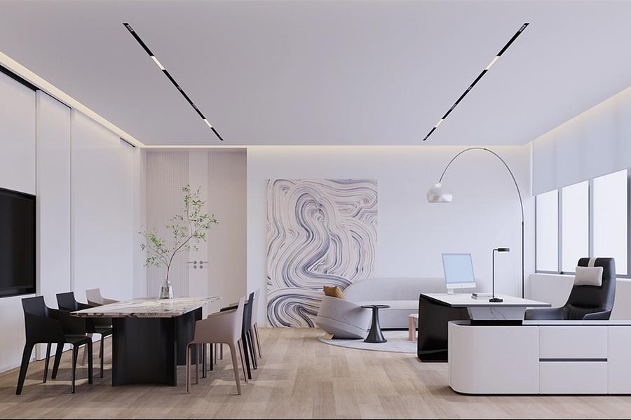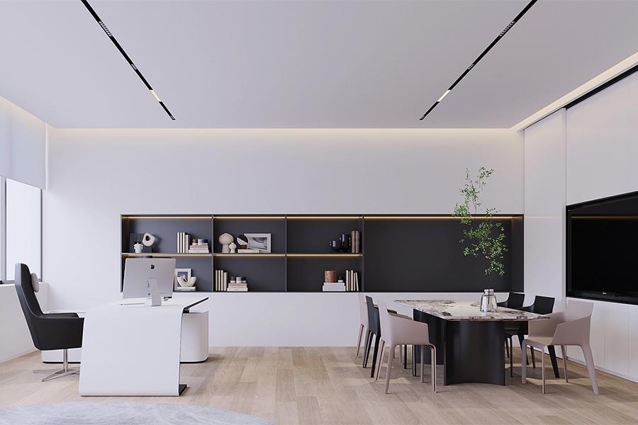 而位于核心区的总裁办公室,则是轻奢与多功能的融合体:黑白灰的基调里,温润的木质地板中和了冷调的锐利,定制的嵌入式柜体以暗藏的灯光勾勒出收纳的秩序,既满足了办公文件的规整,又以艺术摆件点缀出空间的气质;一侧的休闲区以柔软的沙发与肌理感挂画铺陈,工作之余的片刻休憩,或是小型的私密洽谈,都能在这一方空间里自然发生,让办公不再是单一的效率场,更是兼顾质感与温度的私域。相邻的会议室延续了整体的简约调性,石材纹理的会议桌搭配轻盈座椅,既适配高效的商务沟通,又以低调的材质肌理传递出企业的专业感,隐藏式收纳与智能设备的嵌入,让每一次会议都能在整洁与便捷中推进。