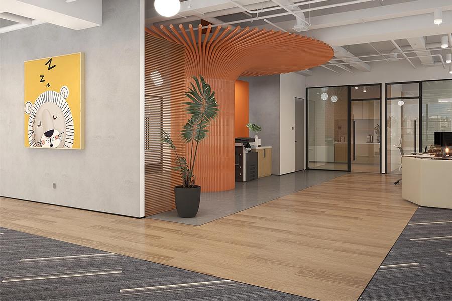 推开玻璃门,弧形木纹吊顶如舒展的羽翼铺展而来,暖橙色的格栅肌理在光影里晕开柔和的张力 —— 这是空间给人的第一重问候。墙面的发光品牌标识简洁醒目,与一旁的艺术装置呼应,既锚定了企业的视觉记忆点,又以现代设计语言消解了商务空间的疏离感。地面的水泥灰与木纹材质自然过渡,悄然划分出动线与驻留区,而几株舒展的绿植则为硬朗的空间注入了自然的呼吸感;壹西格玛的设计巧思,从踏入空间的第一秒便已显现。
