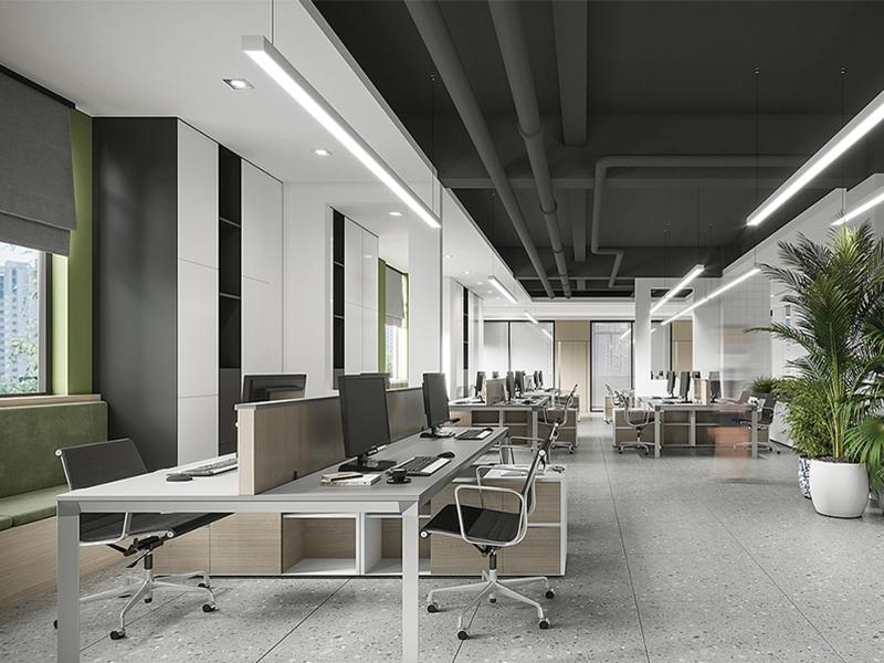 办公区域整体空间宽敞明亮,采用了简洁的设计元素。天花板没有做过多的吊顶装饰,黑色的顶面与白色的墙面形成鲜明对比,搭配上白色的线性灯带,极具时尚感与科技感。开放式办公桌布局灵活,确保每位员工都能享受到充足的自然光线与舒适的工作环境。