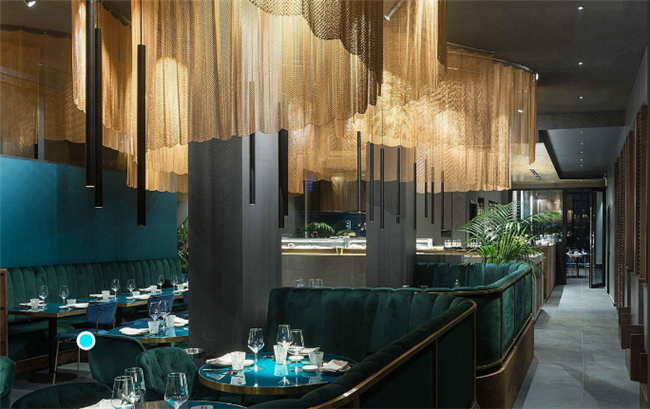 在空间规划方面,要与总体设计风格互相搭配,可通过虚的手法遮挡视线在空间布置上,利用布幔、珠帘、屏风等制造视线缓冲,或者利用通道的回绕曲折相通,适当的分隔设计还满足了客人对于私密性的需求。