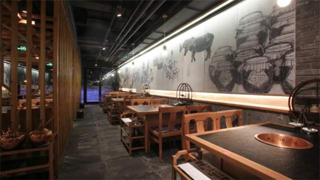 如果是新中式设计风格的火锅店,木质设计叠加的顶部、灰砖隔断、莲花造景都是不错的选择。新中式风格的设计能够使得店面大而不空、厚而不重,有格调的同时又不显得压抑,空间充满禅意。