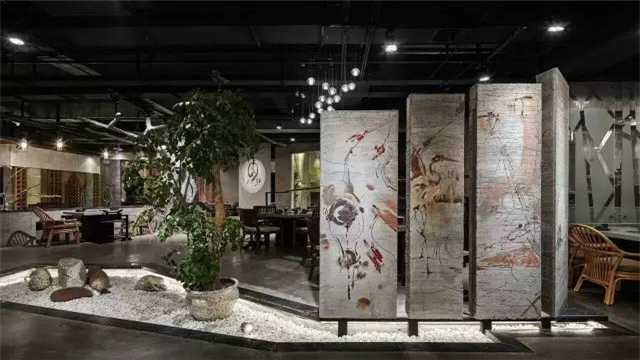 这么一看,花600万的豪装似乎是有点太阔绰了。其实也并不一定。这家店采用主题式包厢设计,每个包间自带风情。以山石、影壁为景观隔断,装修风格更有内容和层次。食客不光是吃了火锅,更欣赏了美景。