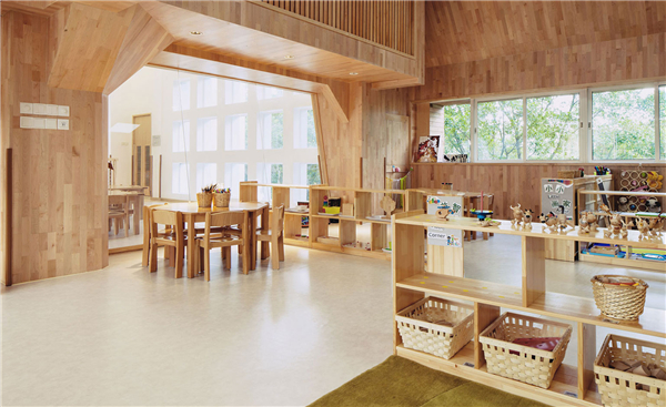 大部分国外幼儿园户外活动场地虽也有橡胶地面,但是自然材料仍然是可以见到的。比如:沙地、草地、戏水池和攀爬区等,墙面用木料比较多,都更注重安全环保。